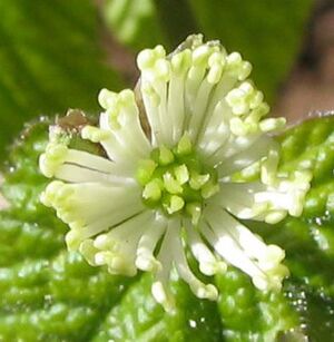 Goldenseal (Orange-root, Orangeroot; Hydrastis canadensis) is a perennial herb in the buttercup family Ranunculaceae, native to southeastern Canada and the northeastern United States. It may be distinguished by its thick, yellow knotted rootstock. The stem is purplish and hairy above ground and yellow below ground where it connects to the yellow rhizome. The plant bears 2 palmate, hairy leaves with 5-7 double-toothed lobes and single, small, inconspicuous flowers with greenish white stamens in the late spring. It bears a single berry like a large raspberry with 10-30 seeds in the summer.[1]